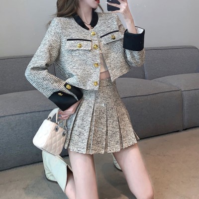 French Color-Blocked High-Waisted Pleated Skirt Two-Piece Set