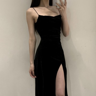 Velvet Sling Exposed Lock Bone High Slit Formal Dress