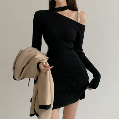 Knit Sweater Halter Neck Strapless Long Sleeve Winter Dress