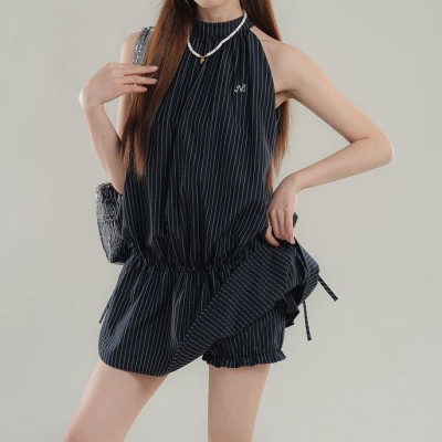 Striped Elastic Waist Dress Flower Bud Shorts Set