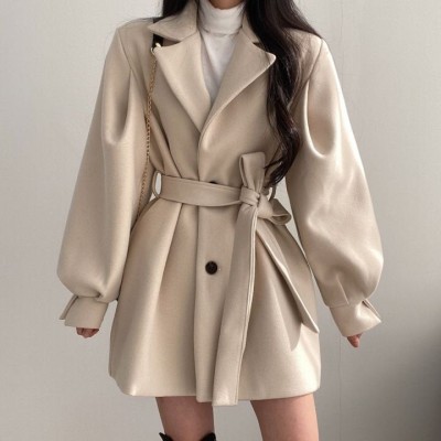 Warm Woolen Coat With Lantern Sleeves And Belt