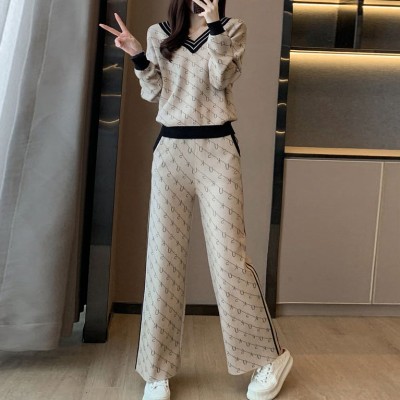 Letter V-Neck Sweater Knitted Straight Pants Set